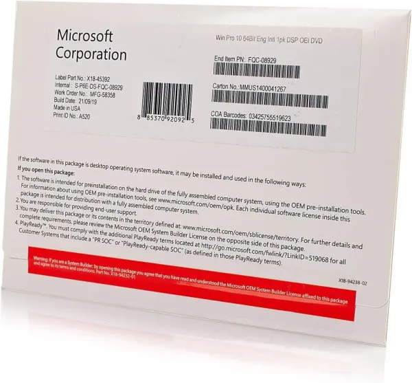 Microsoft Windows 10 Pro OEI DVD With Activation Key, 64 Bit